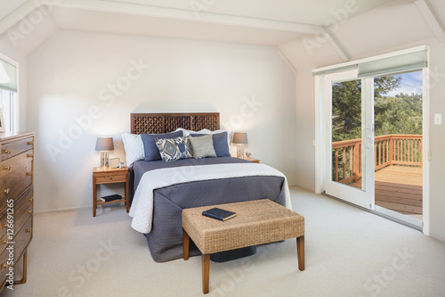 Traditional Bedroom With Sliding Door Leading To Wooden Deck